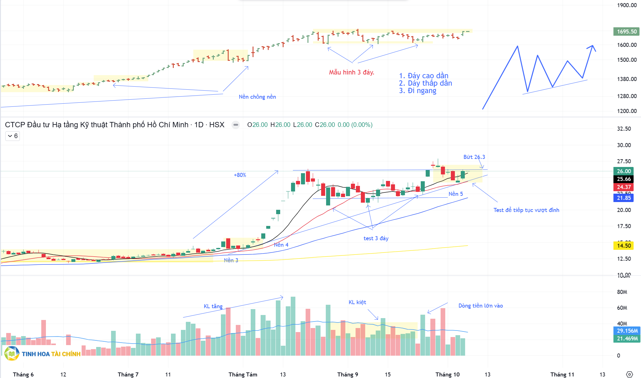 Tiếp nối bài viết trước về cổ phiếu CII với mẫu hình dạng 3 đáy cao dần thì hiện tại CII đã có nhịp test lại nhịp vượt đỉnh vừa qua để tăng giá tiếp. Xem bài viết trước:
