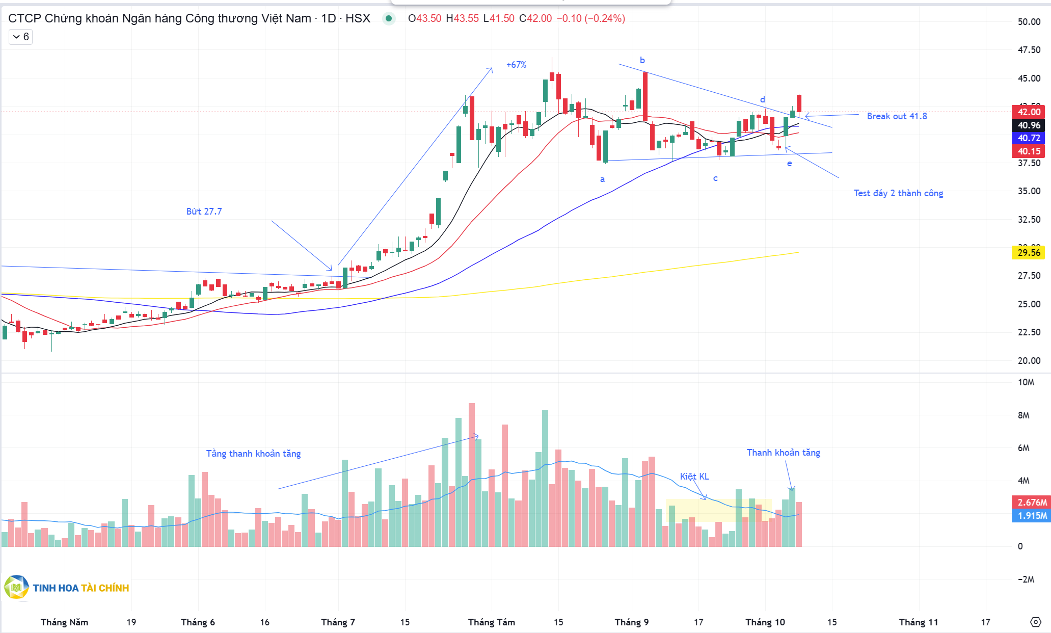 Đồng thời trên cổ phiếu ở phiên giao dịch ngày 7.10.2025 cổ phiếu đã có phiên bứt thoát vùng 41.8 để thoát khỏi mẫu hình tam giác, trước đó cổ phiếu liên tục có hơn 3 lần test lại nguồn cung ở mẫu hình tam giác, hay nói cách khác lượng cung không trào ra. Đây cũng là một trong 3 cổ phiếu ở nhóm chứng khoán Huấn đánh giá cao sẽ vượt đỉnh ở giai đoạn này gồm SSI, VIX, CTS.