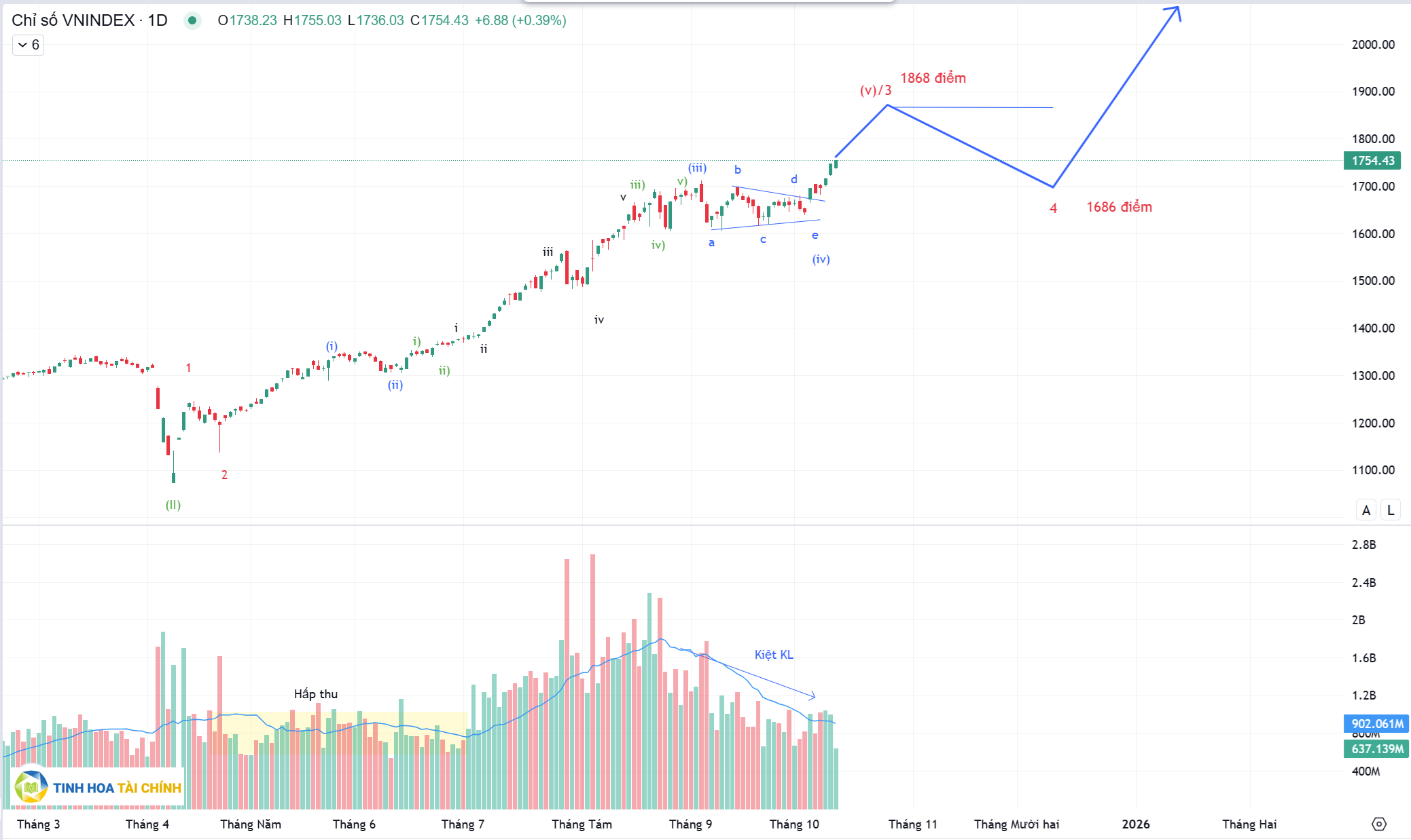 Với việc chỉ số VNIndex thoát ra khỏi mẫu hình tam giác dạng a-b-c-d-e ở sóng (iv) trong cấu trúc sóng đẩy 3 thì mục tiêu hướng đến của chỉ số VNIndex quanh 1868 điểm và sau đó hiệu chỉnh sóng 4 về đâu đó các ngưỡng 1686 -1600 điểm rồi chinh phục sóng tăng 5 trong sóng (III)
