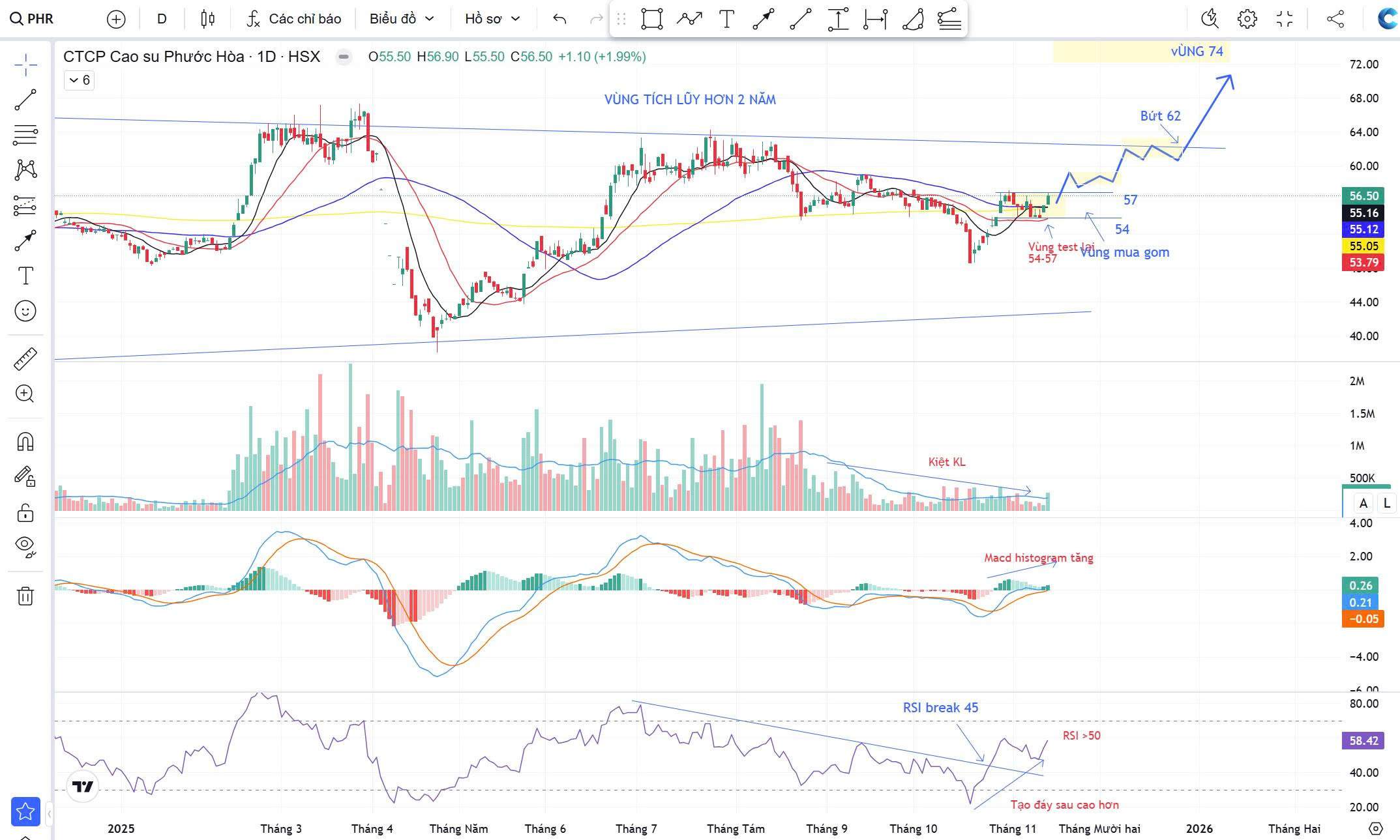 Đồ thị phân tích kỹ thuật của PHR tương đối sạch, sau khi tích lũy 2 năm với dạng tam giác đối xứng, trải qua nhiều thăng trầm đặc biệt sự kiện thuế quan ngày 9/4/2025 tác động trực tiếp đến diễn biến giá cổ phiếu. Vơi cú rũ bỏ vào cuối tháng 11 thì cổ phiếu đang lấy lại trend đồng thời vùng kiệt khối lượng hơn 3 tháng vừa qua cho thấy lượng cung được hấp thu kiệt quệ. Các chỉ báo như Macd histogram hay RSI đều thể hiện có lực mua.