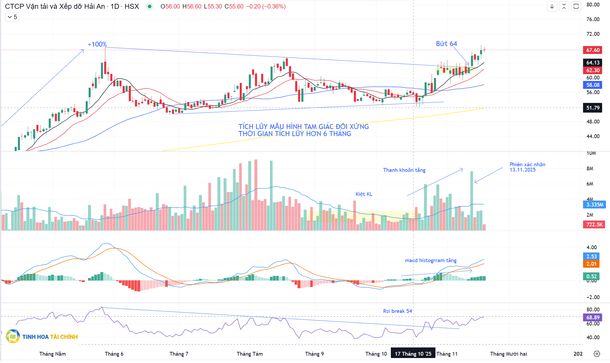 Trên đồ thị phân tích kỹ thuật HAH đã có phiên xác nhận vào sóng ngày 13.11.2025 khi bứt thoát vùng 64, đây là điểm thoát mẫu hình tam giác đối xứng. Đồng thời với dạng mẫu hình này với mức tăng trừ 25% -30% với 1 nền giá thì mức giá quanh 80 cũng sẽ là vùng hợp lý về mẫu hình.