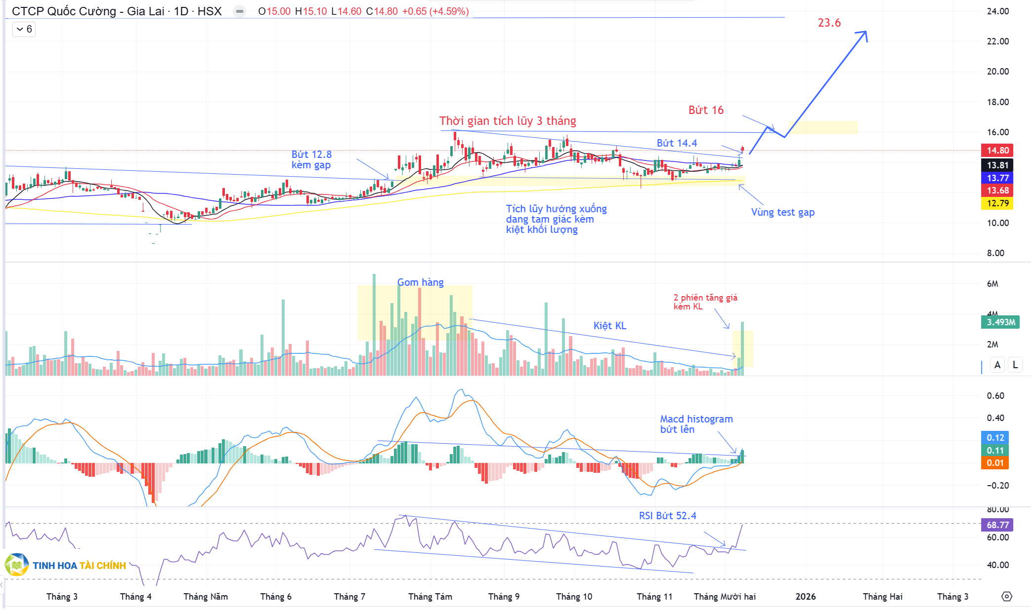 Cổ phiếu sau phiên 8.12.2025 đã bứt thoát mẫu hình tích lũy 3 tháng dạng tích lũy hướng xuống với khoảng trống gap được mở ra. Trước đó cổ phiếu cũng đã test và lấp gap thành công vùng gap được mở hồi 8/2025. Ngoài ra chỉ báo RSI đã bứt thoát khỏi kênh giá song song trong bối cảnh cổ phiếu chưa bứt được đỉnh 16 thì đây là manh mối ngoại suy để đặt cược cổ phiếu có thể vượt đỉnh đoạn này để hướng về các vùng kháng cự kênh trên vùng 21-23. Chi tiết hình bên dưới:
