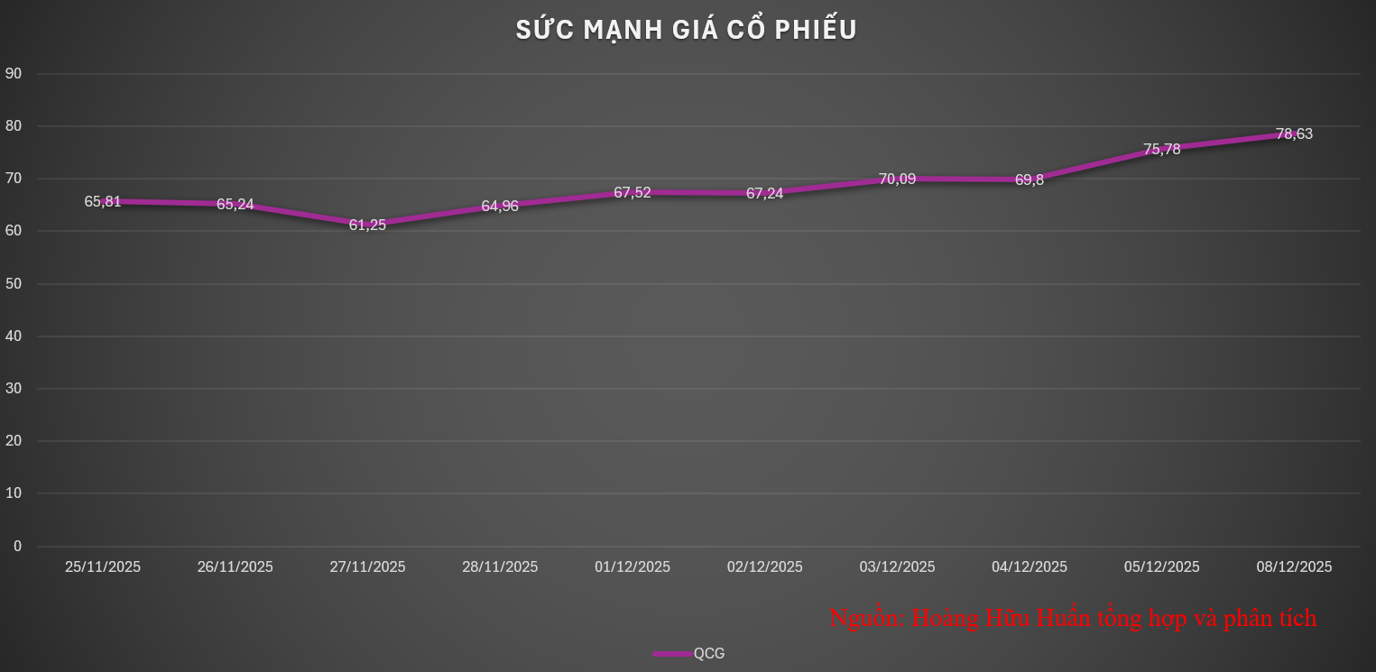 Sức mạnh giá cổ phiếu trong 10 phiên vừa qua có sự cải thiện và tăng mạnh trong 2 phiên vừa qua. Điều này phù hợp với diễn biến giá trên đồ thị mà Huấn đã đề cập ở phía bên trên. HIện tại sức mạnh giá của QCG là 78.63 đây là mức mà cổ phiếu chuẩn bị bước sang nhịp bứt tốc mạnh hơn là 80, nếu giá cổ phiếu tăng mà duy trì trên 90 thì đây là cổ phiếu mạnh. Điều này cần chờ 1 vài phiên tới để xem vận động của cổ phiếu như thế nào ?