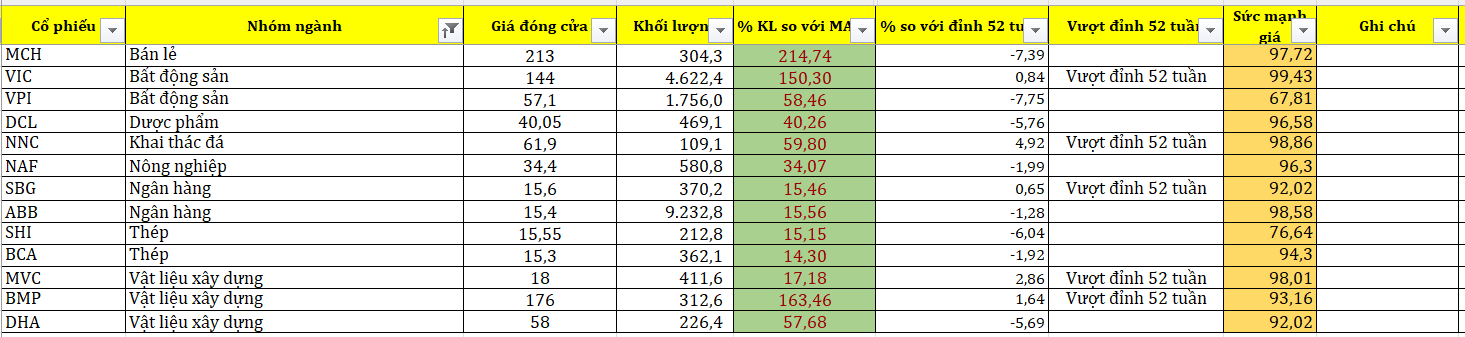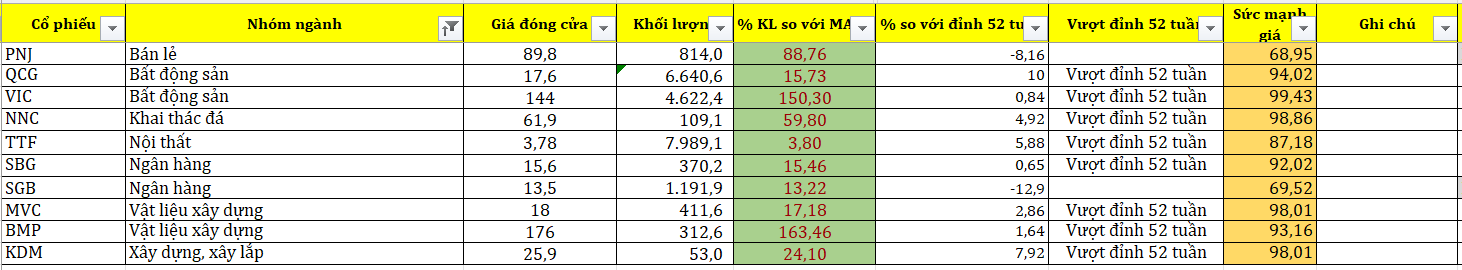Danh sách những cổ phiếu quanh vùng đỉnh 52 tuần +/-10% thấy rõ sự suy yếu về mặt số lượng và chất lượng các cổ phiếu. Điều này hoàn toàn phù hợp với diễn biến của chỉ số VNIndex giai đoạn này, đồng thời chiến lược cũng cần điều chỉnh trong ngắn hạn thì đây là nhịp để các cổ phiếu thị trường hồi phục, còn trong trung và dài hạn thì vùng trao tay này sẽ mở ra điểm mua cho năm 2026.