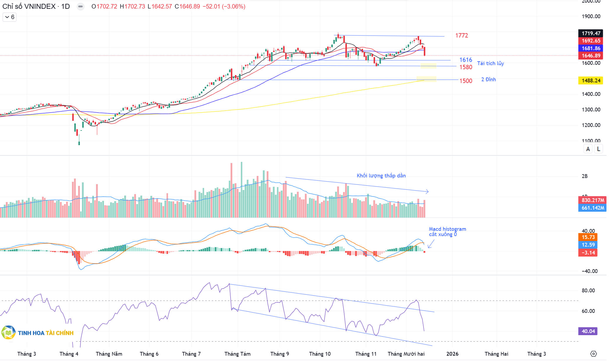Vùng 1681 điểm trọng yếu của thị trường quanh ma50 ngày đã bị xuyên thủng và khối lượng đang có dấu hiệu bung dần. Đây là tín hiệu tích cực của giai đoạn quá trình chuyển giao hàng từ nhà đầu tư các nhân sang tổ chức. Tuy nhiên để tổ chức gom lại lượng hàng đã thoát ra kể từ phiên 20/10/2025 thì cần cú rũ bỏ mạnh hơn để “cướp” lại lượng hang giá rẻ với số lượng nhiều hơn.