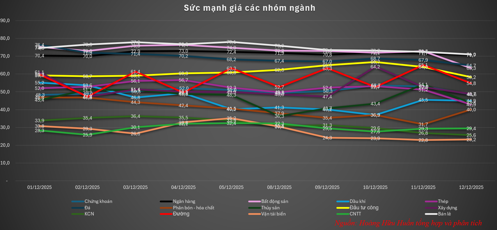 Hầu hết các nhóm ngành đề có dấu hiệu suy yếu sau phiên thứ 6 vừa qua, đồng thời với việc thượng tầng chuẩn bị có nhân sự mới cũng tác động khá lớn đến các chính sách, định hướng. Điều này thấy rõ của sự phản ứng giá nhóm cổ phiếu bất động sản với nhiều cổ phiếu nằm sàn. Hiện tại sức mạnh giá nhóm ngành ngân hàng và chứng khoán vẫn đang là 2 nhóm duy trì được sức mạnh, nếu thị trường ở đây có sự sang tay hoảng loạn thì 2 nhóm này sẽ hồi phục tốt.