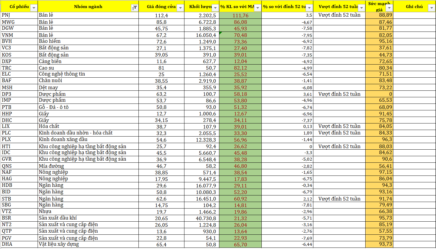 Danh sách cổ phiếu quanh vùng đỉnh 52 tuần +/8% cho thấy số lượng cổ phiếu giảm sút và tập trung vào vài cổ phiếu. Các phiên đầu tuần sau dự kiến danh sách này sẽ tiếp tục giảm sút do thị trường rung lắc. Đề cho các nhóm ngành củng cố xu hướng rung lắc và vào được sóng.