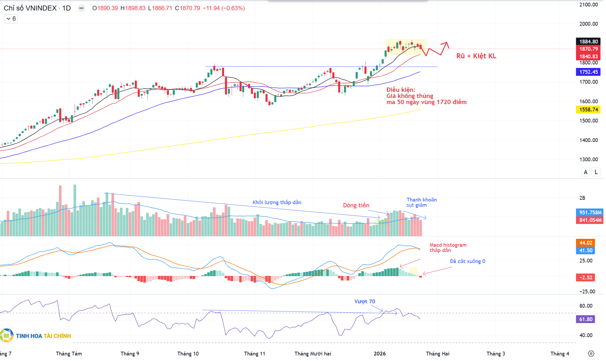 Trên đồ thị phân tích kỹ thuật chỉ số VNIndex thấy rõ 1 nhịp rung lắc sắp tới khi giá đóng cửa dưới đường ma10 ngày vùng 1884 điểm và chỉ báo chậm Macd histogram đã cắt xuống 0, cho thấy lực bán đang chiếm ưu thế. Với diễn biến hiện tại Huấn đánh giá thị trường điều chỉnh lành mạnh hơn là cú bulltrap vì các nhóm ngành yếu như chứng khoán, bất động sản không có dấu hiệu phá đáy. Đặc biệt cổ phiếu nhóm bất động sản hôm thứ 5 ngày 22.01.2026 tăng trần đồng loạt và sau đó giữ được phiên tăng giá.